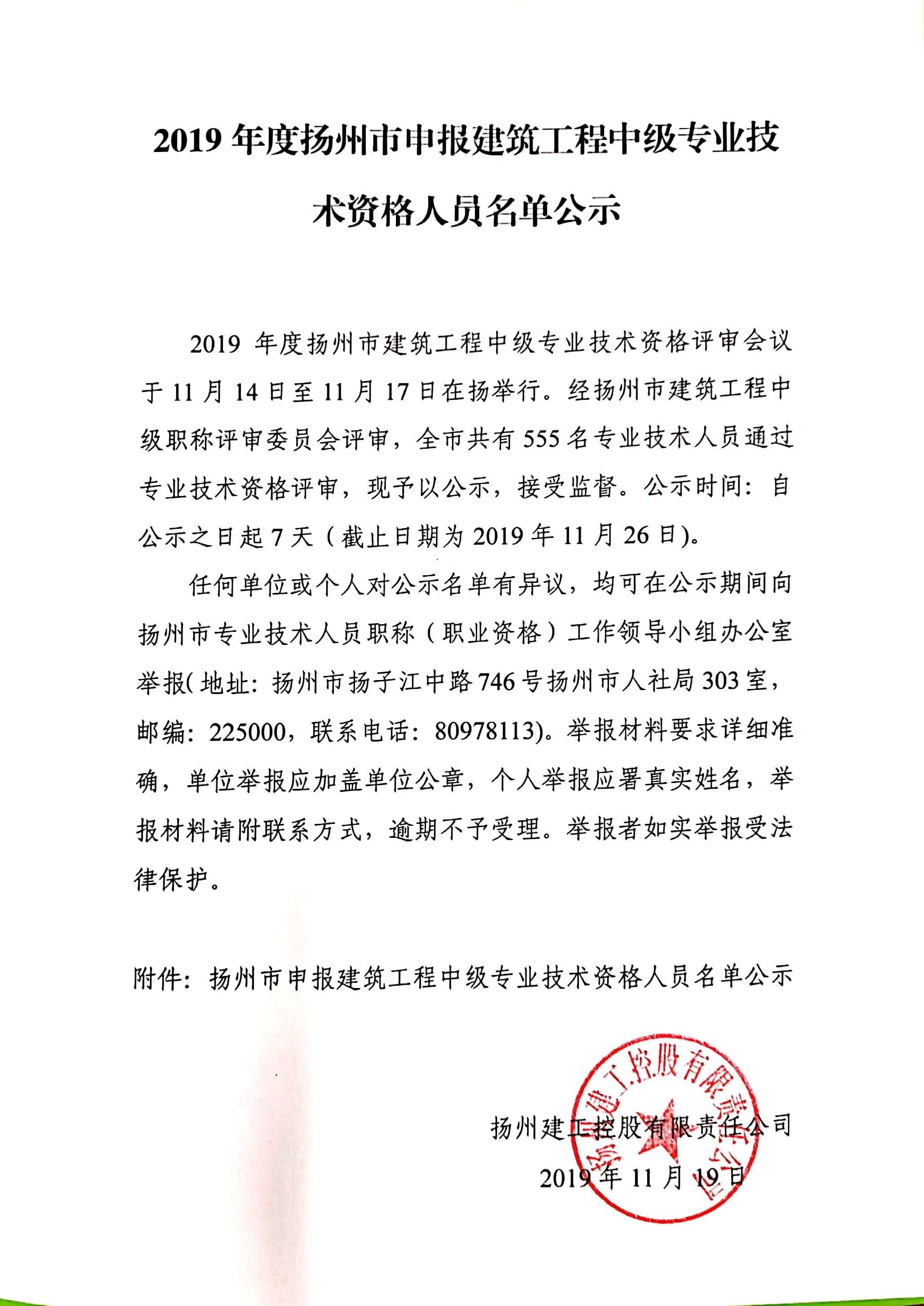 2019年度扬州市建筑工程中级专业技术资格评审会议于11月14日至11月17日在扬举行。经扬州市建筑工程中级职称评审委员会评审,全市共有555名专业技术人员通过专业技术资格评审,现予以公示,接受监督。公示时间:自公示之日起7天(截止日期为2019年11月26日)。